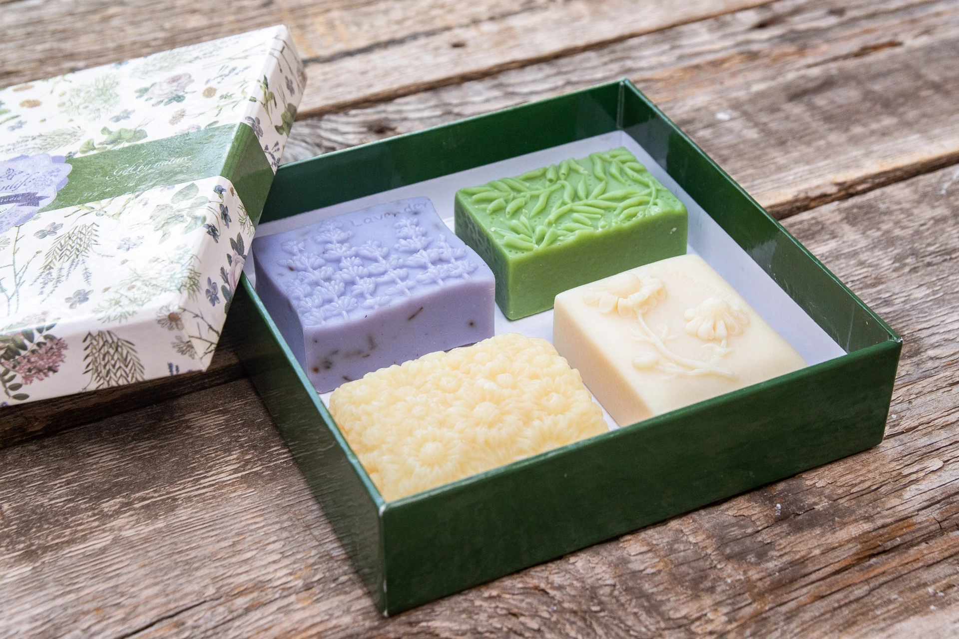 levendula szappan 90 gr rozmaring sz. 70 gr körömvirág sz. 80 gr, kamilla szappan 80 gr. díszdobozban