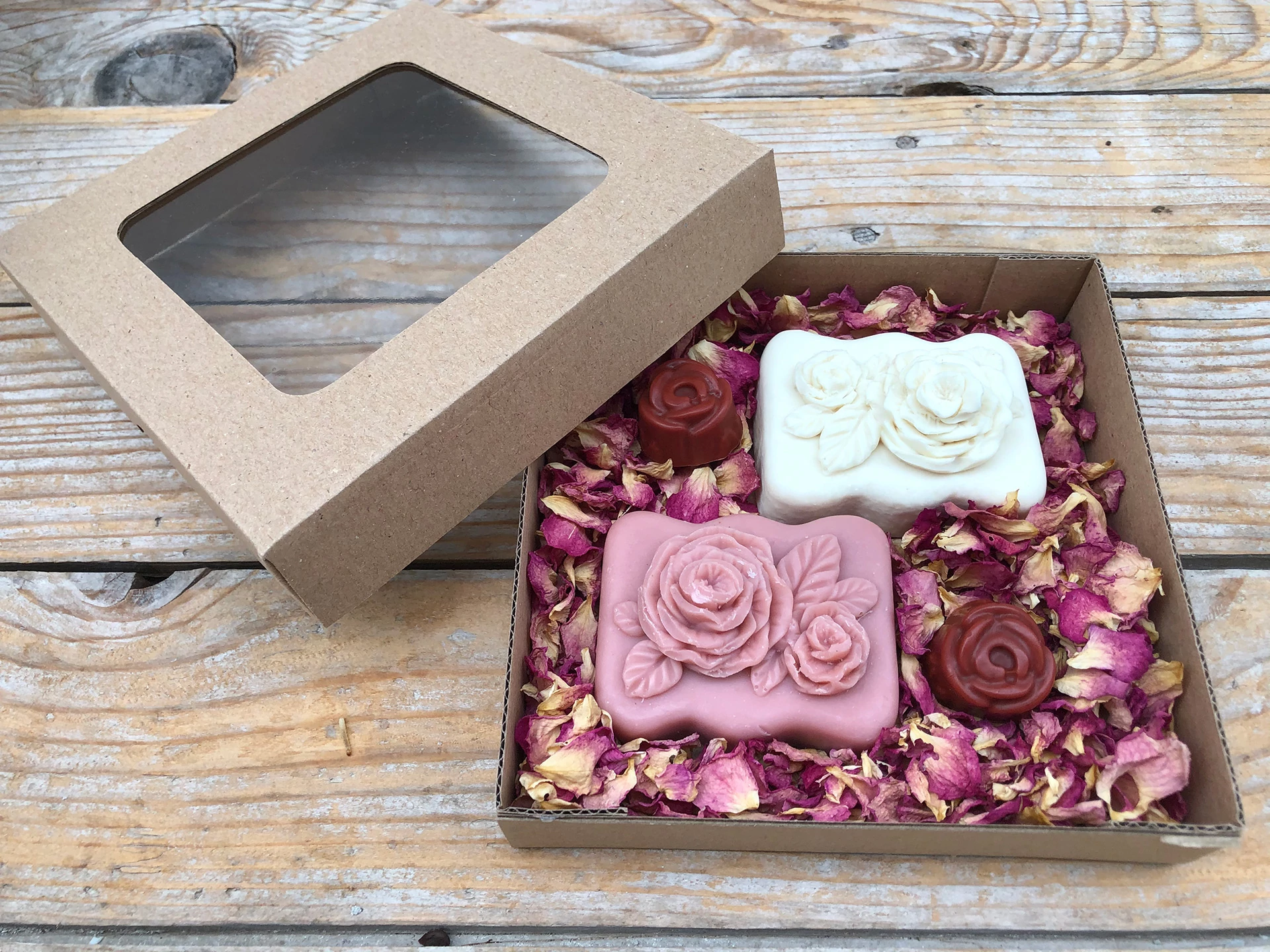 rózsavarázs szappan 70 gr és kecsketej szappan 70 gr szárított rózsaszirom ágyon, ablakos natúr dobozban